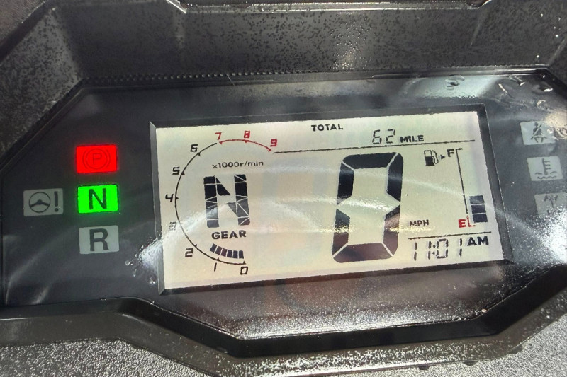 The display has a large LCD screen, multiple trip functions, battery-voltage readout, a tachometer array, and more. It tilts with the wheel for easier reading.